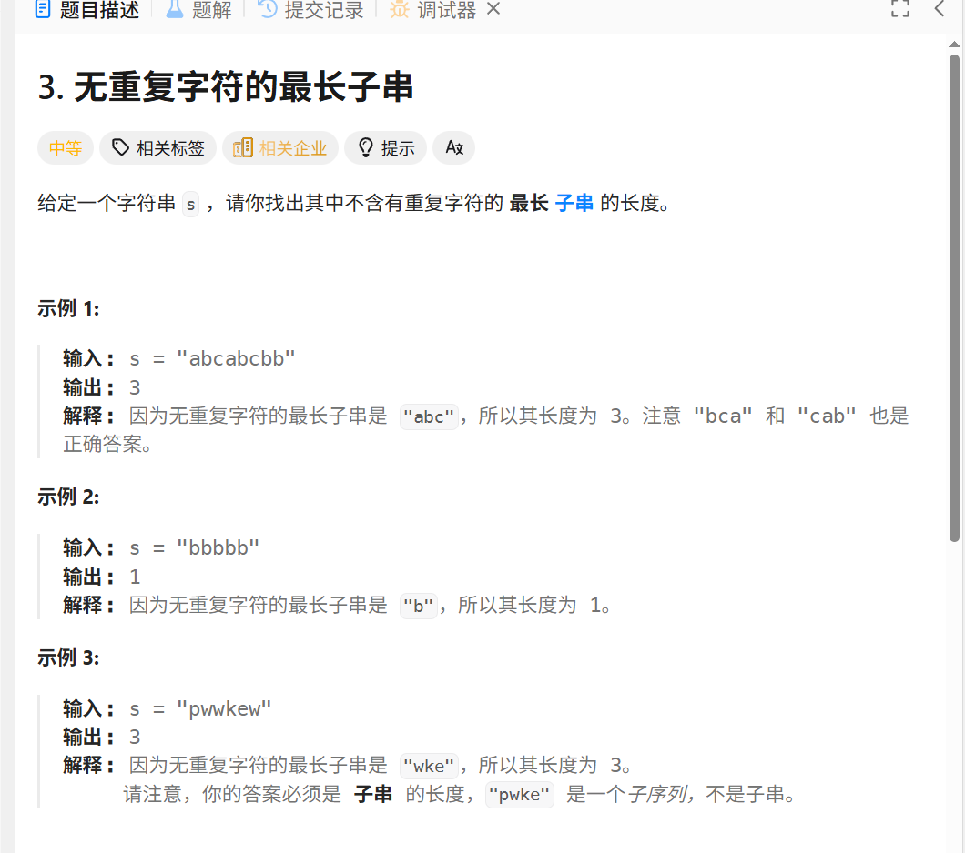class Solution:def lengthOfLongestSubstring(self, s: str) -> int:str_set = set()R , n = -1 , len(s)res = 0for L in range(n):if L != 0:str_set.remove(s[L-1])while R+1<n and s[R+1] not in str_set:str_set.add(s[R+1])R +=1res = max(res,R-L+1)return res