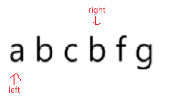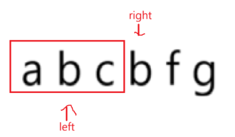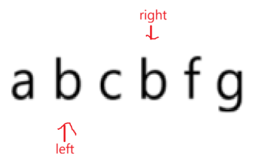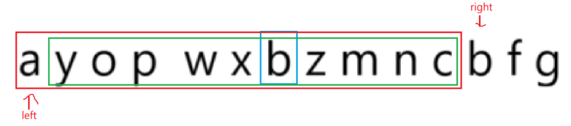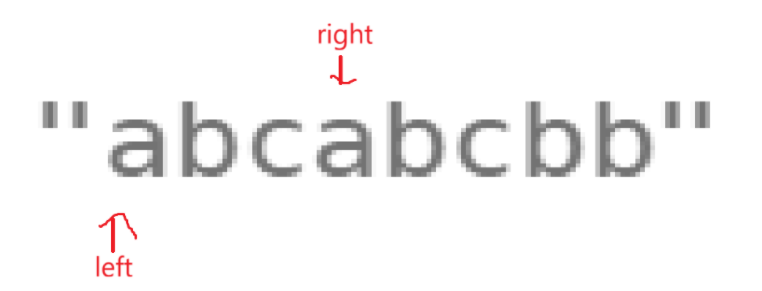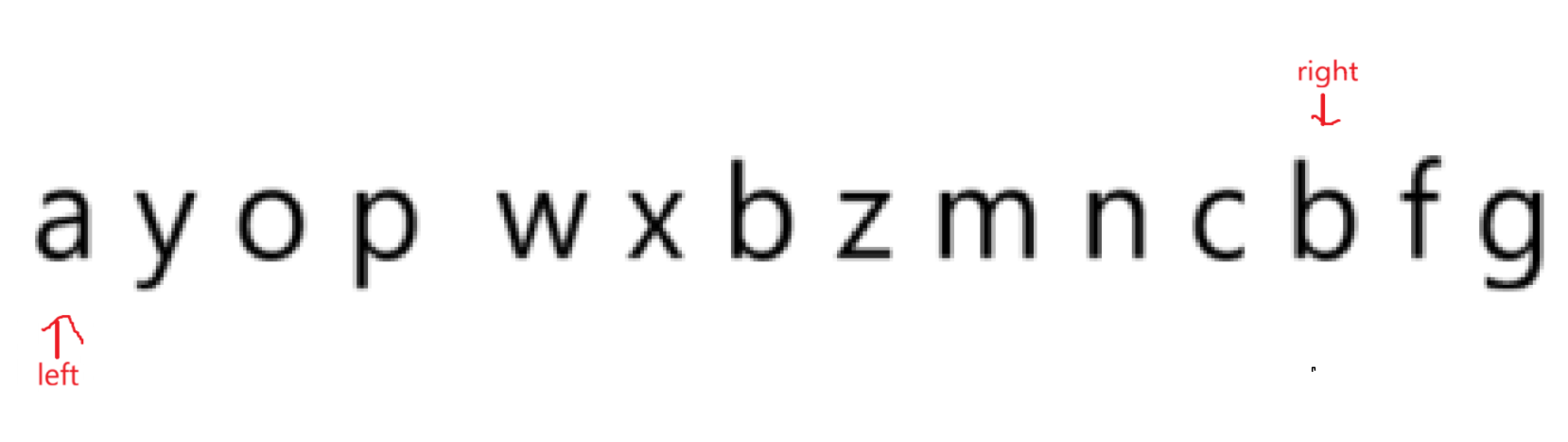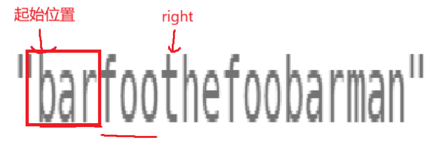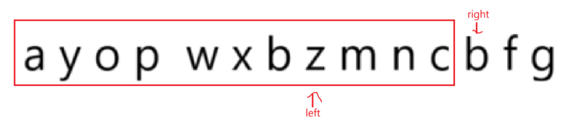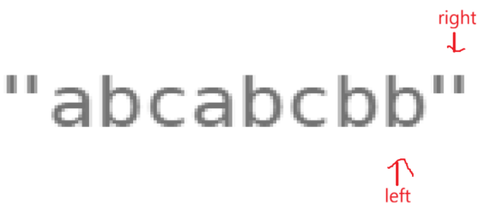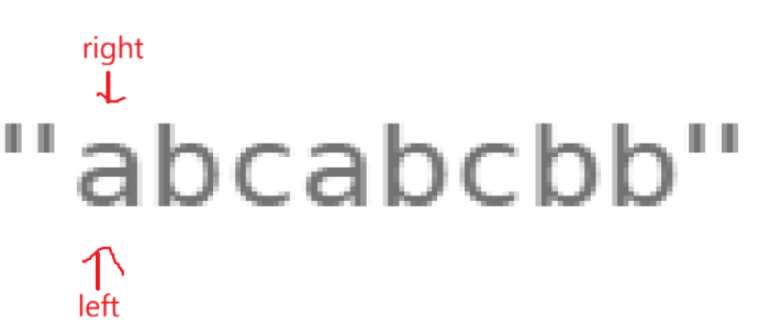 不难发现,刚刚记录过一个区间以后,你肯定是直接++left,这个时候如果令right = left,重新开始遍历,到时候最少right也得移动到当前图上位置才能符合要求,因为我们定left走right一定是刚刚好使得覆盖才停止,图上right包含的最后一个字符是关键。