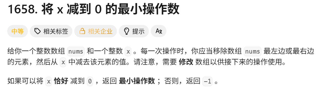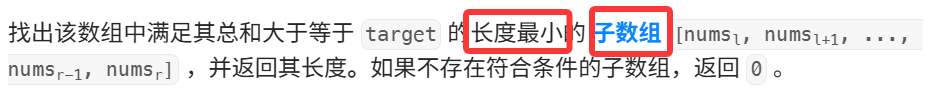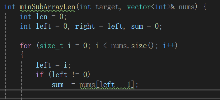 public:int minSubArrayLen(int target, vector<int>& nums) {int len = 0;for (size_t i = 0; i < nums.size(); i++){int left = i;int right = left;int sum = 0;while (right < nums.size()){if (sum < target)sum += nums[right++];else{if (sum >= target)if (len == 0){len = right - left;break;}else{len = len <= right - left ? len : right - left;break;}}}}return len;}