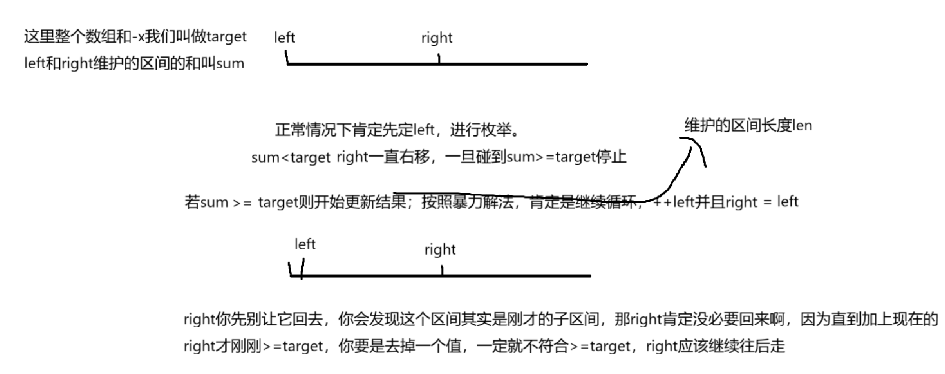 到时候肯定是外面一层循环定left,里面一层循环动right,完全可以用一个变量sum每次++right后+=right指向的值,再进行判断,如果符合条件,且比len小就更新len,不符合或者不比记录下来的len小就不用更新。