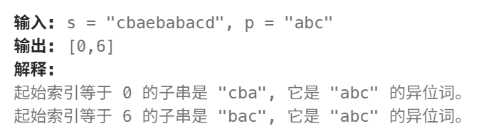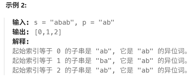 public:bool check(int* hash1, int* hash2){for (int i = 0; i < 26; i++)if (hash1[i] != hash2[i])return false;return true;}vector<int> findAnagrams(string s, string p) {int left = 0;int right = p.size() - 1;int hash1[26] = { 0 };for (auto& e : p){++hash1[e - 'a'];}int hash2[26] = { 0 };for (int i = 0; i < p.size(); i++){++hash2[s[i] - 'a'];}vector<int> v;while (right < s.size()){if (check(hash1, hash2))v.push_back(left);--hash2[s[left++] - 'a'];++right;if (right < s.size())++hash2[s[right] - 'a'];elsebreak;}return v;}