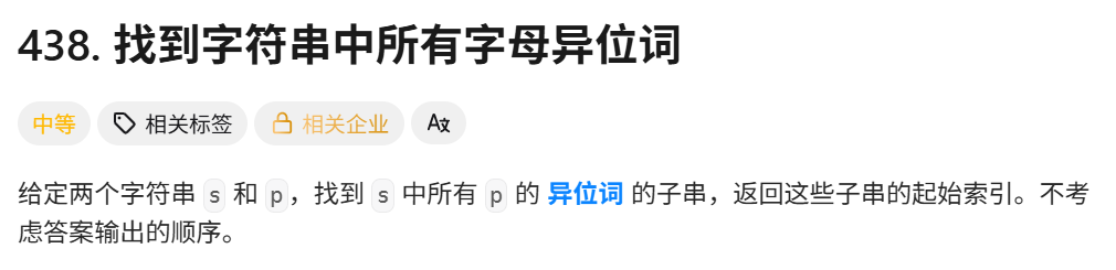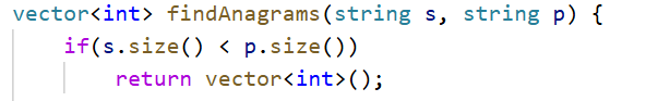 public:bool check(int* hash1, int* hash2){for (int i = 0; i < 26; i++)if (hash1[i] != hash2[i])return false;return true;}vector<int> findAnagrams(string s, string p) {if(s.size() < p.size())return vector<int>();int left = 0;int right = p.size() - 1;int hash1[26] = { 0 };for (auto& e : p){++hash1[e - 'a'];}int hash2[26] = { 0 };for (int i = 0; i < p.size(); i++){++hash2[s[i] - 'a'];}vector<int> v;while (right < s.size()){if (check(hash1, hash2))v.push_back(left);--hash2[s[left++] - 'a'];++right;if (right < s.size())++hash2[s[right] - 'a'];elsebreak;}return v;}