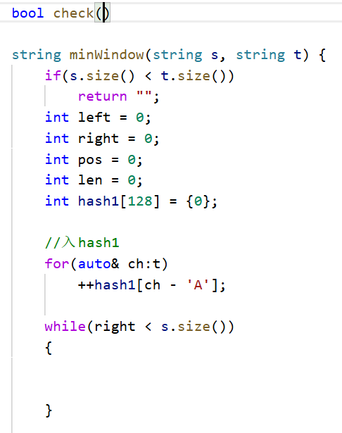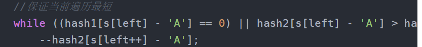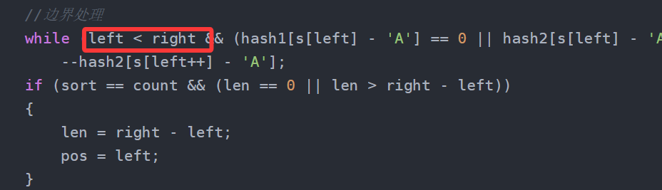 public:string minWindow(string s, string t) {if (s.size() < t.size())return "";int left = 0;int right = 0;int pos = 0;int len = 0;int hash1[128] = { 0 };int count = 0;//记录种类//入hash1for (auto& ch : t)if (!hash1[ch - 'A']++)++count;int sort = 0;int hash2[128] = { 0 };while (right < s.size()){if (sort < count){if (++hash2[s[right] - 'A'] == hash1[s[right] - 'A'])++sort;++right;}else{//保证当前遍历最短while ((hash1[s[left] - 'A'] == 0) || hash2[s[left] - 'A'] > hash1[s[left] - 'A'])--hash2[s[left++] - 'A'];if (len == 0 || len > right - left){pos = left;len = right - left;}//到这left指向的一定是刚好==t中字符串的字符--hash2[s[left++] - 'A'];--sort;}}//边界处理while (left < right && (hash1[s[left] - 'A'] == 0 || hash2[s[left] - 'A'] > hash1[s[left] - 'A']))--hash2[s[left++] - 'A'];if (sort == count && (len == 0 || len > right - left)){len = right - left;pos = left;}return s.substr(pos, len);}