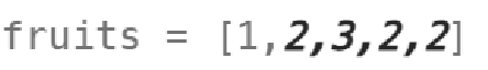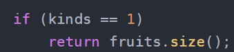 public:int totalFruit(vector<int>& fruits) {int left = 0;int right = 0;int len = 0;int kinds = 0;int hash[100000] = { 0 };while (right < fruits.size()){if (hash[fruits[right]] == 0)++kinds;hash[fruits[right]]++;++right;if (kinds > 2){len = len >= right - left - 1 ? len : right - left - 1;while (kinds > 2){--hash[fruits[left]];if (hash[fruits[left]] == 0)--kinds;++left;}}}if (kinds == 2)len = len >= right - left ? len : right - left;if (kinds == 3 && (hash[fruits[right - 1]] != hash[fruits[right - 2]]))len = len >= right - 1 - left ? len : right - 1 - left;return len;}