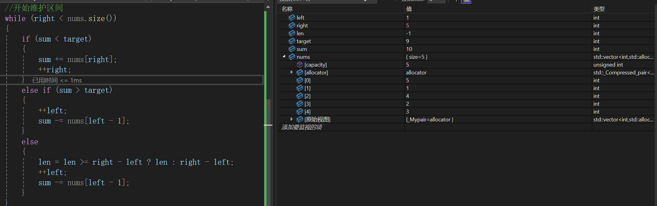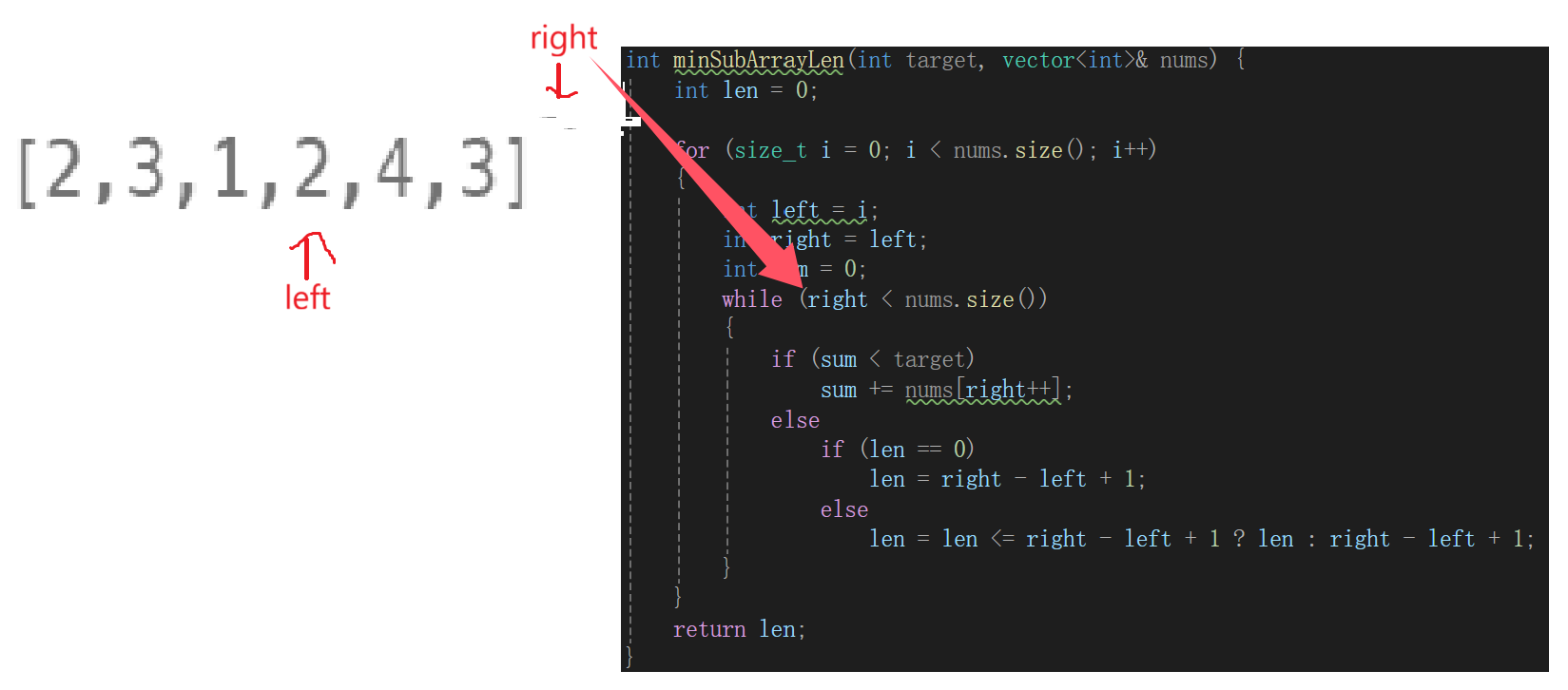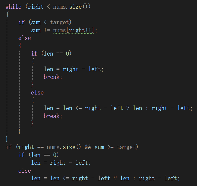 public:int minSubArrayLen(int target, vector<int>& nums) {int len = 0;int left = 0, right = left, sum = 0;for (size_t i = 0; i < nums.size(); i++){left = i;if (left != 0)sum -= nums[left - 1];while (right < nums.size()){if (sum < target)sum += nums[right++];else{if (len == 0){len = right - left;break;}else{len = len <= right - left ? len : right - left;break;}}}if (right == nums.size() && sum >= target)if (len == 0)len = right - left;elselen = len <= right - left ? len : right - left;}return len;}