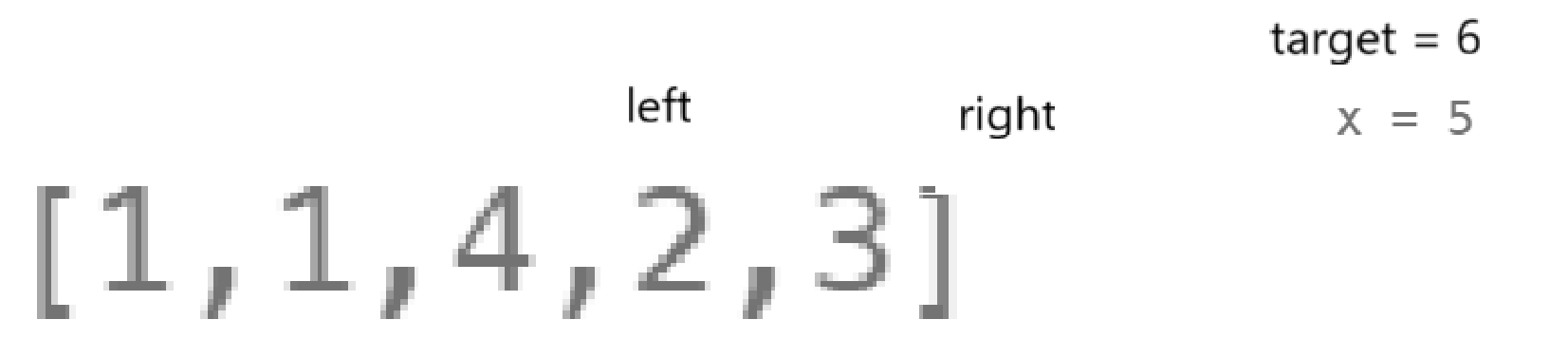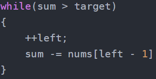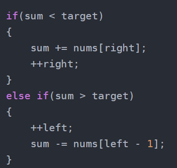 - 如果此时区间内所有的值的和sum不够target,那么下面的循环还会让right右移继续遍历,这一点循环完成: