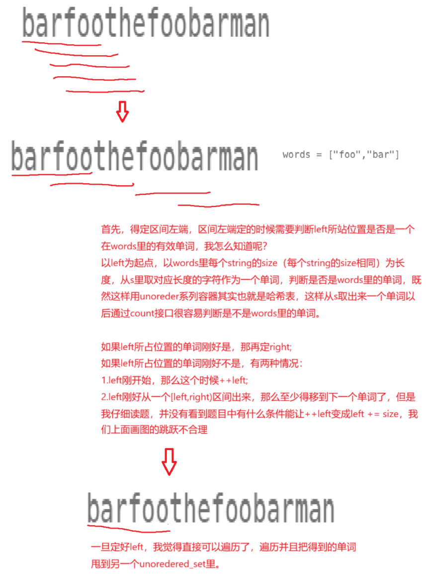 剩下其实for循环进行的是标准的滑动窗口,right的位置进一个单词,判断以后把最开始的单词出了,下次判断前再根据right位置进一个单词。