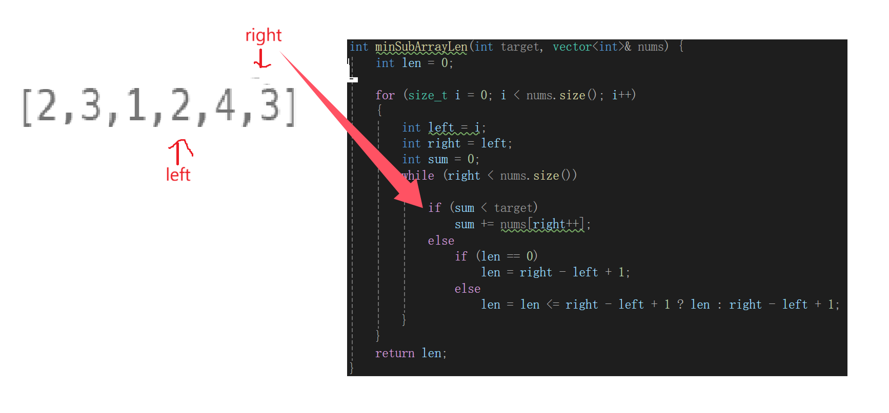 public:int minSubArrayLen(int target, vector<int>& nums) {int len = 0;for (size_t i = 0; i < nums.size(); i++){int left = i;int right = left;int sum = 0;while (right < nums.size()){if (sum < target)sum += nums[right++];else{if (len == 0){len = right - left;break;}else{len = len <= right - left ? len : right - left;break;}}}if (right == nums.size() && sum >= target)if (len == 0)len = right - left;elselen = len <= right - left ? len : right - left;}return len;}