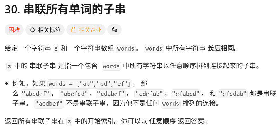 public:bool isinside(string& s, int begin, int len){string word;for (int i = begin; i < begin + len; i++){word += s[i];}return hash1.count(word);}//写check的时候保证至少长度是够sum的bool check(string& s, int begin, int len, int sum){unordered_map<string, int> hash2;//先入哈希表for (int i = begin; i < begin + sum; i += len){string str;for (int j = i; j < i + len; j++){str += s[j];}++hash2[str];}//遍历对比for (auto& [k, v] : hash1){if (hash2[k] != v)return false;}return true;}vector<int> findSubstring(string s, vector<string>& words) {int len = words[0].size();int num = words.size();int sum = len * num;int left = 0;int right = sum;vector<int> v;if (s.size() < sum)return v;//如果合法还是进hash1for (auto& e : words){++hash1[e];}while (right < s.size()){if (isinside(s, left, len)){if (check(s, left, len, sum)){v.push_back(left);++left;++right;}else{++left;++right;}}else{++left;++right;}}if(isinside(s, left, len)&&check(s, left, len, sum))v.push_back(left);return v;}