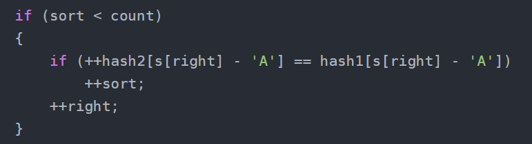 因为这里也不是说,俩哈希表内容必须完全一样,只要覆盖住t即可,所以用sort记录,当你想要入一个字符到hash2,并且这玩意在hash1里有,++以后刚好相等,则当前维护的区间,这个字符肯定符合题目要求,即覆盖到t的字符串。