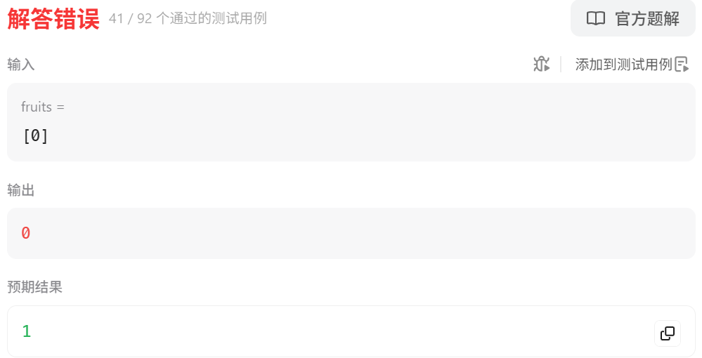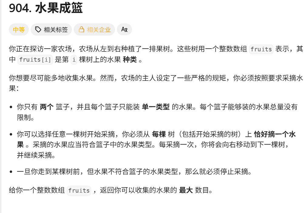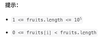 public:int totalFruit(vector<int>& fruits) {int left = 0;int right = 0;int len = 0;int kinds = 0;int hash[100000] = { 0 };while (right < fruits.size()){if (hash[fruits[right]] == 0)++kinds;hash[fruits[right]]++;++right;if (kinds > 2){len = len >= right - left - 1 ? len : right - left - 1;while (kinds > 2){--hash[fruits[left]];if (hash[fruits[left]] == 0)--kinds;++left;}}}if (kinds == 1)return fruits.size();if (kinds == 2)len = len >= right - left ? len : right - left;if (kinds == 3 && (hash[fruits[right - 1]] != hash[fruits[right - 2]]))len = len >= right - 1 - left ? len : right - 1 - left;return len;}