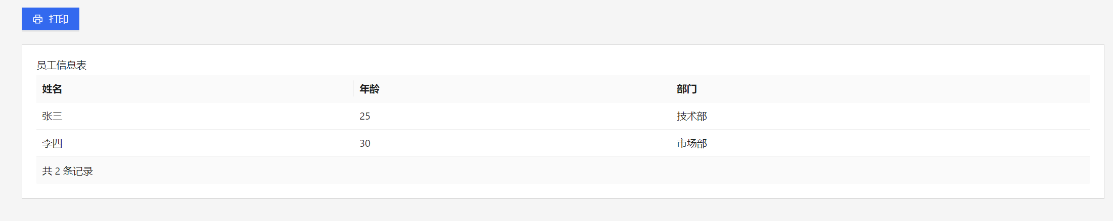 <template><div class="print-container"><!-- 打印按钮 --><a-button type="primary" @click="handlePrint"><PrinterOutlined />打印</a-button><!-- 打印区域 - 只有这个区域的内容会被打印 --><div id="printContent" class="print-area"><h2>员工信息表</h2><!-- Antd表格组件 --><a-table :dataSource="data" :columns="columns" :pagination="false"size="small"><template #footer>共 {{ data.length }} 条记录</template></a-table></div></div>