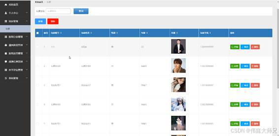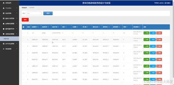 管理员点击战绩信息管理,在战绩信息页面输入场次进行查询或删除战绩信息列表,并根据需要对战绩详细信息进行详情,修改或删除等操作,如图5-11所示。