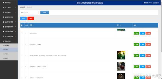 管理员点击系统管理,在游戏咨询输入标题进行查询,新增或删除游戏资讯列表,并根据需要对游戏资讯详细信息进行详情,修改或删除操作;还可以对轮播图管理,关于我们,系统简介等信息进行操作;如图5-12所示。