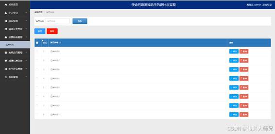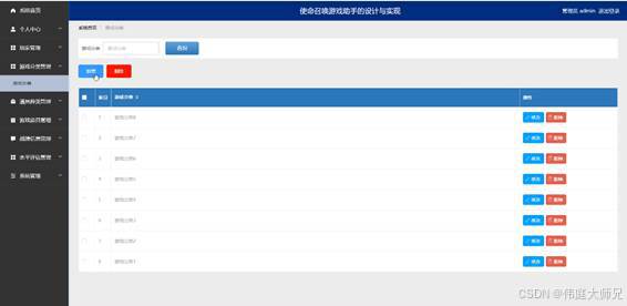 管理员点击游戏分类管理,在游戏分类页面输入游戏分类进行查询,新增或删除游戏分类列表,并根据需要对游戏分类详细信息进行修改或删除等操作,如图5-8所示。