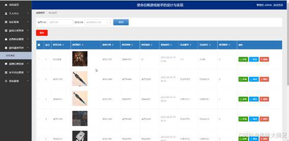 管理员点击游戏道具管理,在游戏道具页面输入道具名称和选择游戏分类进行查询或删除游戏道具列表,并根据需要对游戏道具详细信息进行详情,修改或删除等操作,如图5-10所示。