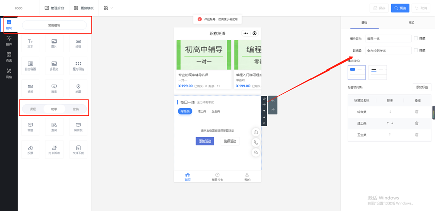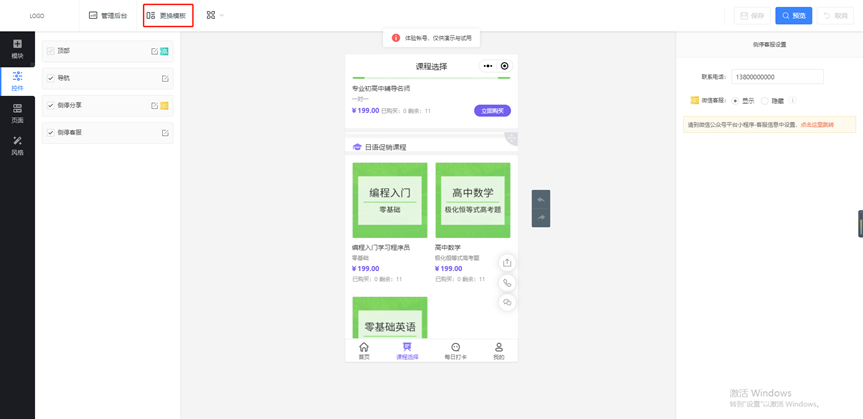 还能在左侧的【模块】【控件】【页面】等选项里完善模板。在【模块】选项中,可添加地图、图文、音频、视频、线下课程、答题、打卡活动、表单、留言板、文件下载、直播、优惠券、拼团等功能。在【控件】与【页面】选项中,能对小程序各页面进行设置,制作添加新页面,还能完善导航、侧停分享、侧停客服等控件功能。
