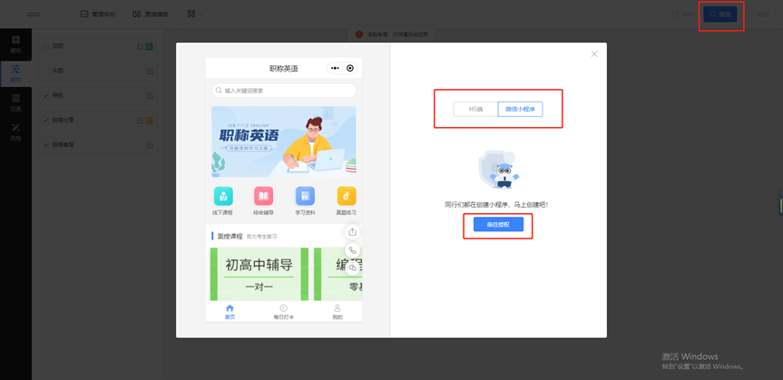 完成培训机构小程序搭建后,点击【预览】保存查看。预览无误,就能上线 H5 端培训机构线上店铺和微信小程序。