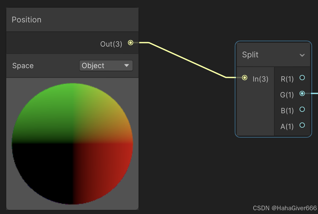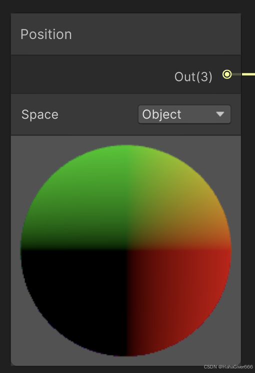 我们的目标是实现一个从模型的脚部到全身填充的一个高亮能量Buff,那么我们需要用到的数据可以提前在脑袋里面构思一下。从下往上,会用到的是Y轴的坐标,又因为是基于模型的,那么这个坐标则应该是游戏物体坐标,这里就会用到一个Position的节点,并设置其坐标空间为Object即游戏物体。