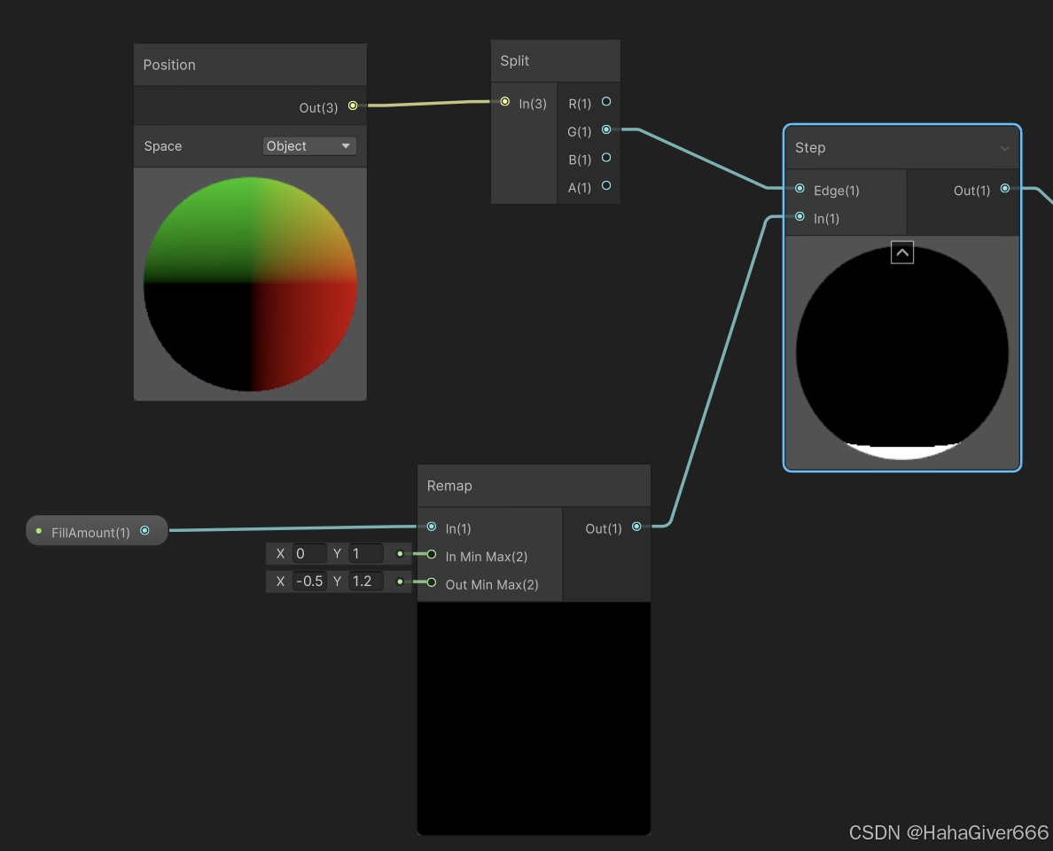 创建一个float类型的变量命名为FillAmount,将其Remap一下(最小值最大值做一个区间变换,从0到1变换到-0.5到1.2,可以理解为坐标分正负),然后接入到一个Step节点(筛选节点,输入的值比Edge小为1,比Edge大为0)。这就有了最基础的从小往上的填充效果。
