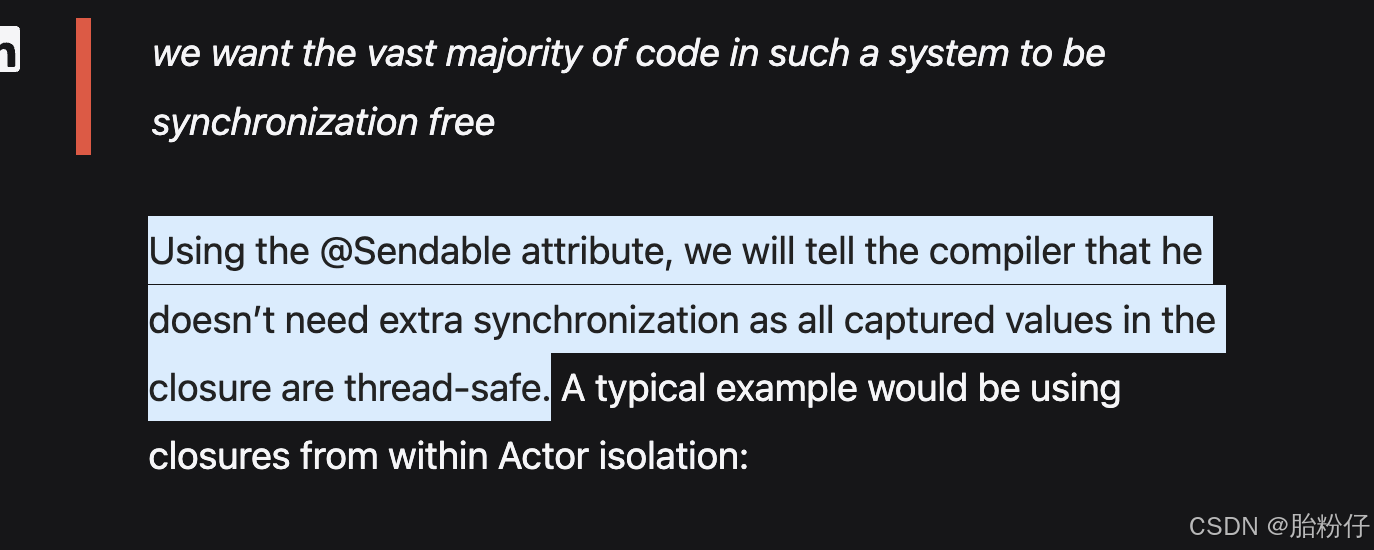 @sendable 就是用来修饰闭包的, 来确保闭包捕获的变量都遵循 sendable 协议; 以此来确保被闭包捕获的变量都是线程安全的.