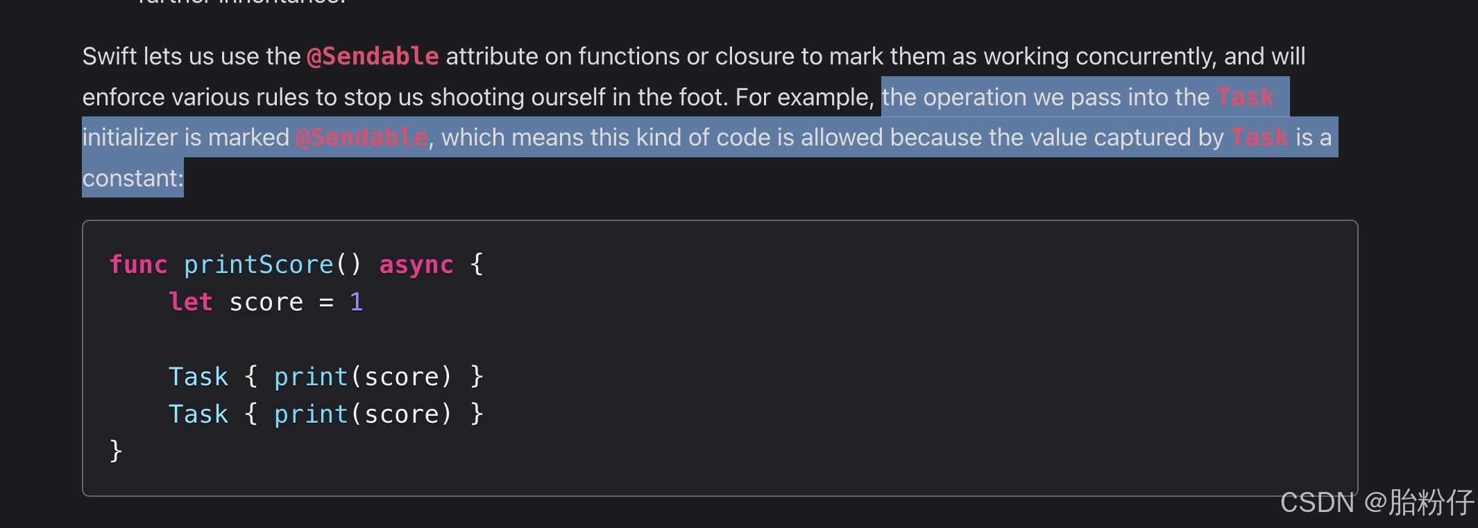 }func startWork() {let score = Score(value: 42) // 创建于 MainActor(主线程)Task.detached { [score] in// 这里进入 Task 的并发域,score 被安全传递进来print("当前分数:\(score.value)")}