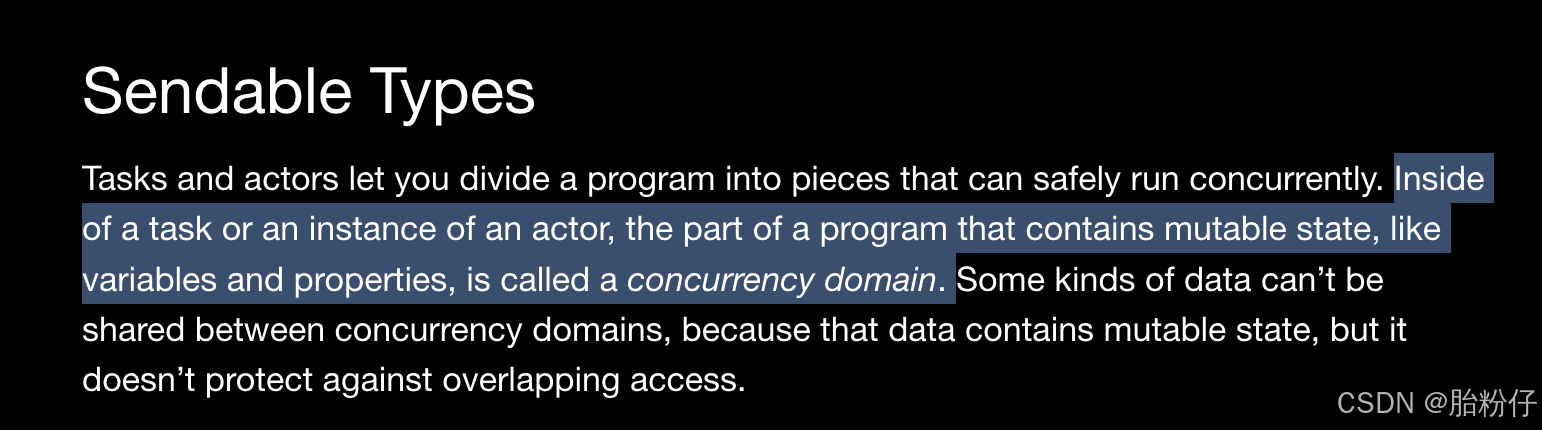 中文翻译就是: 在一个 task 或 actor 的内部, 包含可变参数或可变属性的那部分代码就是一个 concurrency domain.