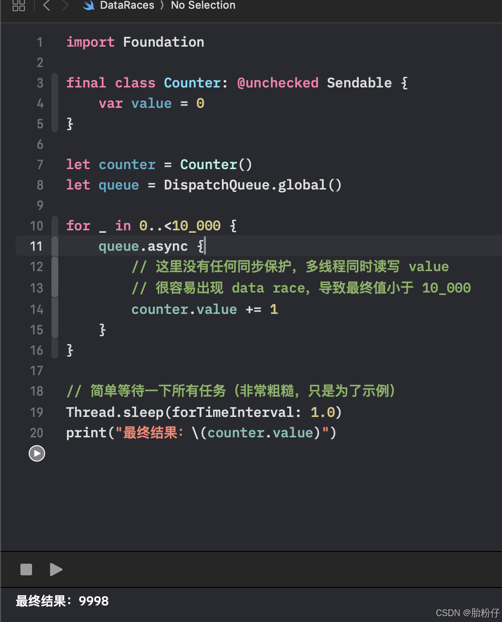 let queue = DispatchQueue.global()for _ in 0..<10_000 {queue.async {// 这里没有任何同步保护,多线程同时读写 value// 很容易出现 data race,导致最终值小于 10_000counter.value += 1}