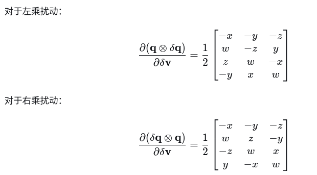 其中 Jδv→q 表示四元数对局部扰动的雅可比导数矩阵。