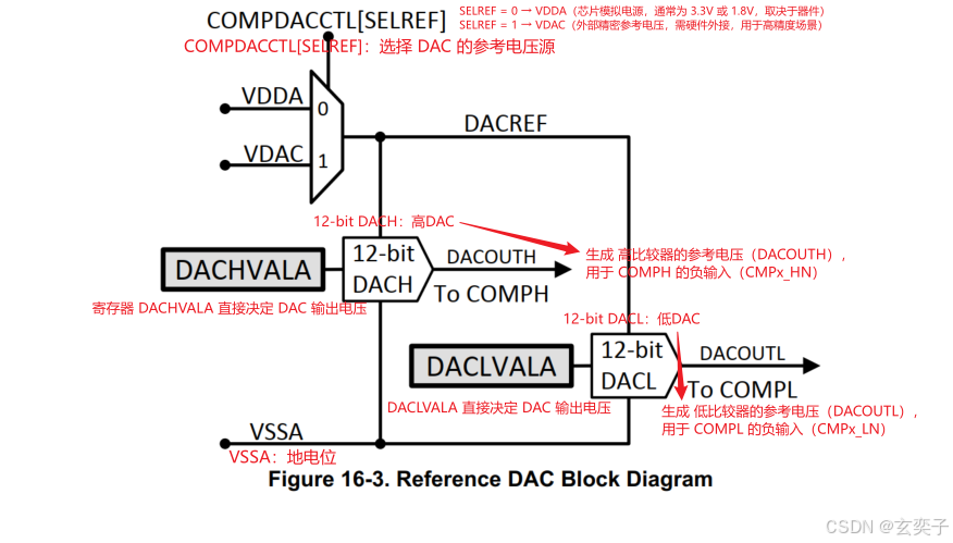 参考12位DAC的工作范围由DACREF和VSSA限定。默认情况下,高压参考电压为VDDA,但可以通过 COMPDACCTL 寄存器配置为VDAC。参考12位DAC如图16-3所示。