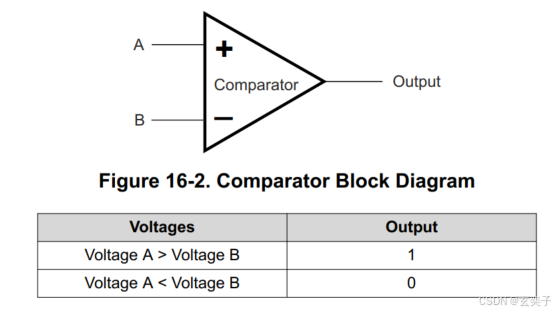 比较器在正输入端的电压大于负输入端的电压时会输出高电平数字信号,在正输入端的电压小于负输入端的电压时则会输出低电平数字信号。比较器如图 16 - 2 所示。