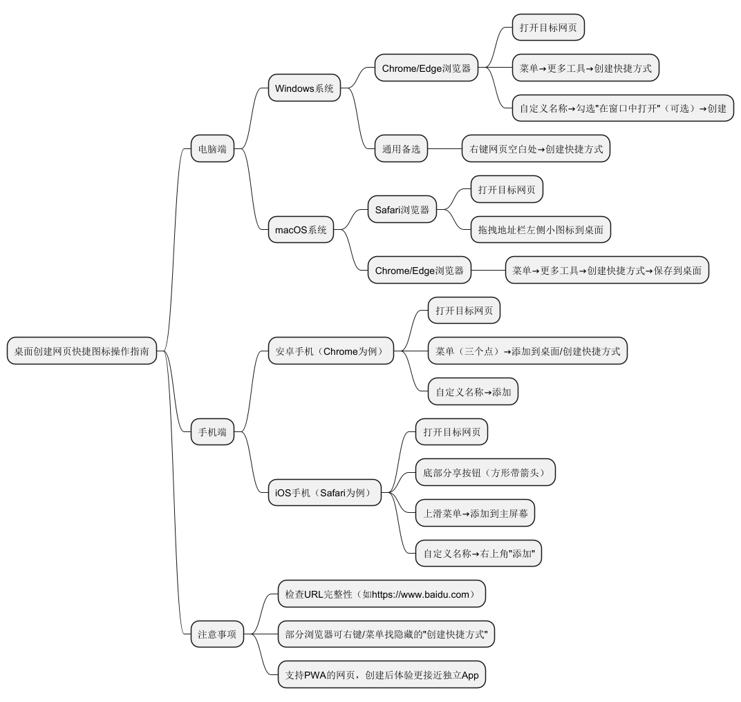 以主流浏览器(Chrome、Edge、Safari 等)为例,操作核心是通过浏览器生成网页快捷方式。