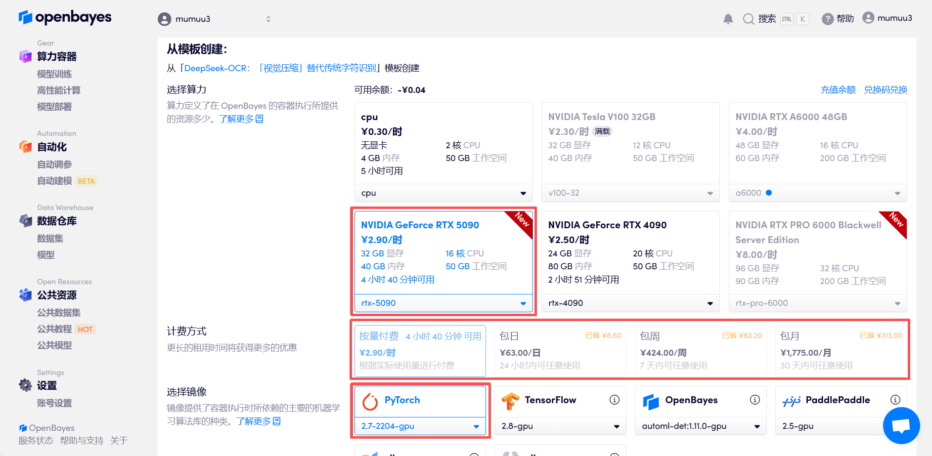 3.选择「NVIDIA GeForce RTX 5090」以及「PyTorch」镜像,按照需求选择「按量付费」或「包日/周/月」,点击「继续执行」。新用户使用下方邀请链接注册,可获得 4 小时 RTX 5090 + 5 小时 CPU 的免费时长!