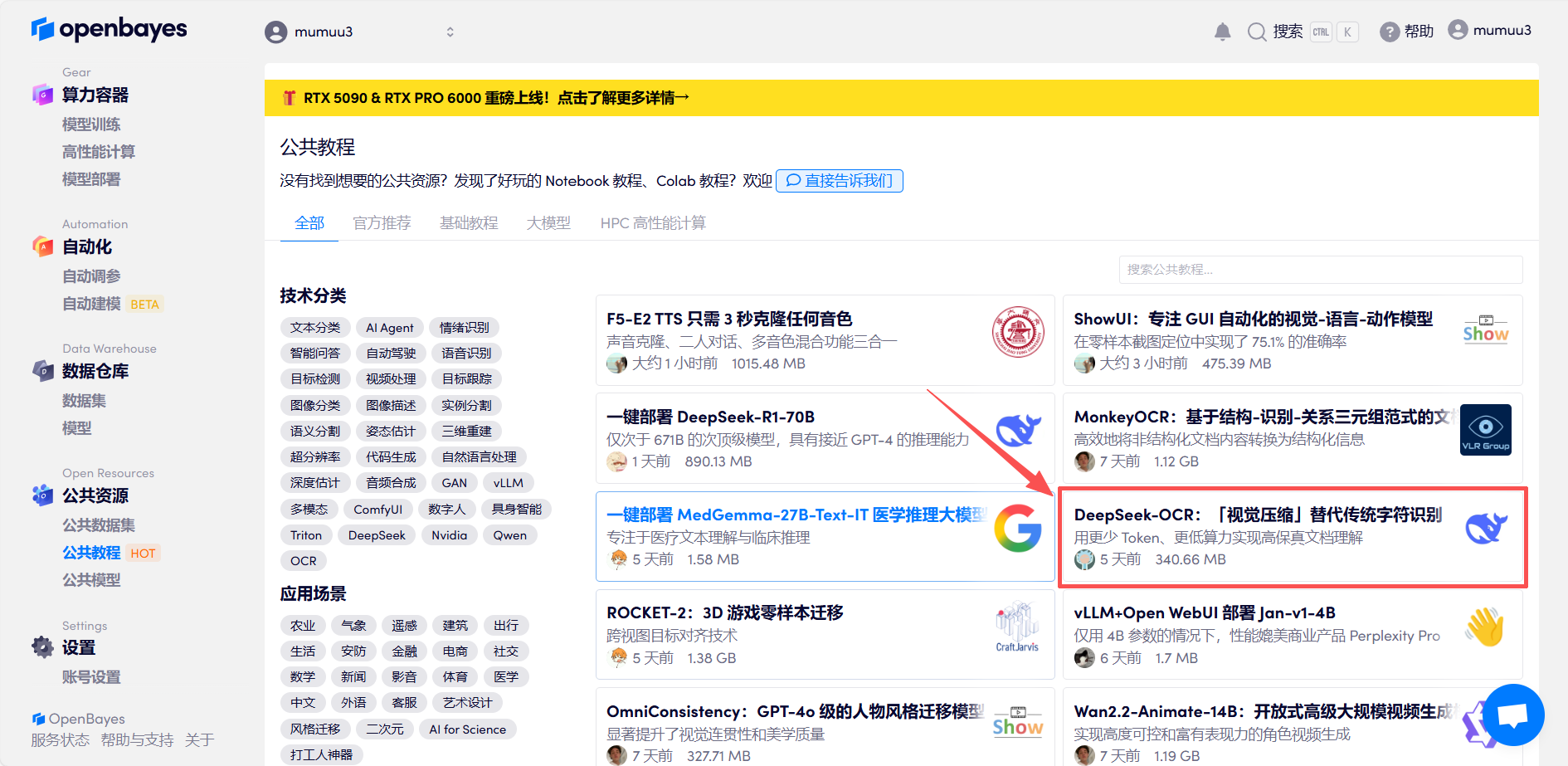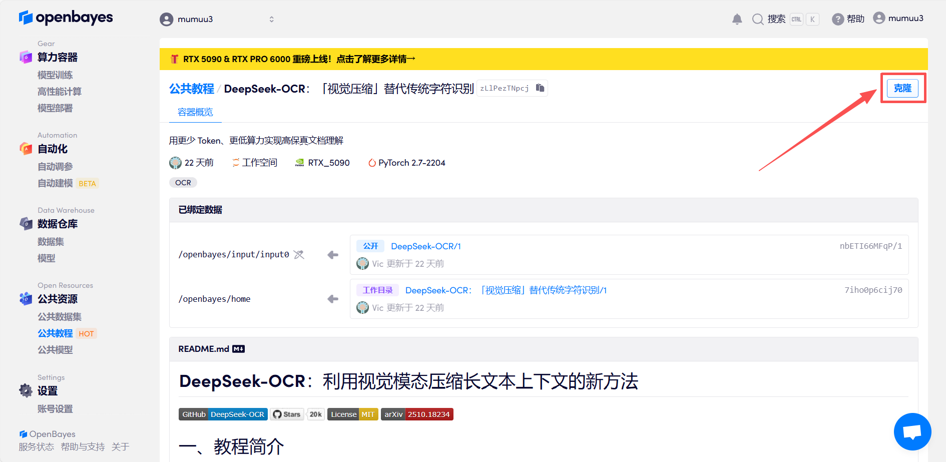 1.登录 http://OpenBayes.com,在「公共教程」页面,选择「DeepSeek-OCR:「视觉压缩」替代传统字符识别」教程。