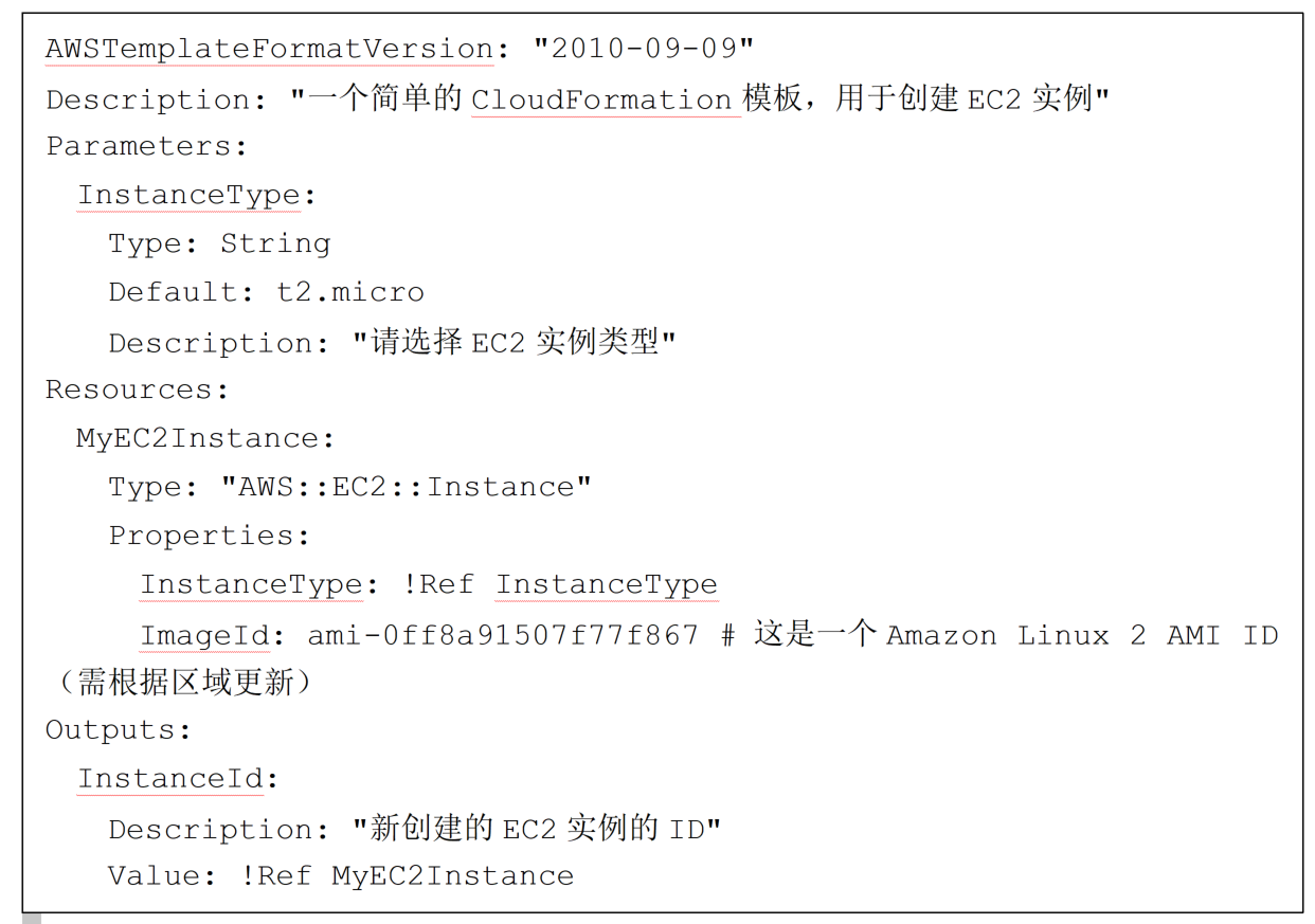 以下是一个极简的YAML格式模板示例,用于创建一个Amazon EC2实例: