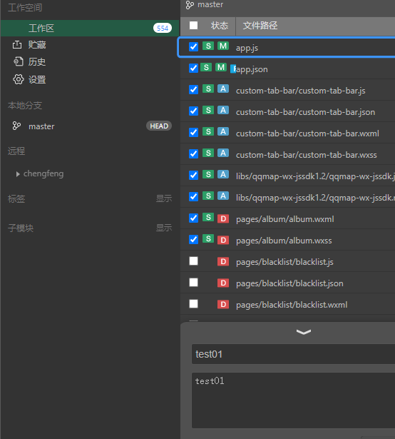点击工作区,勾选状态前面的框就可以把修改的文件上传了