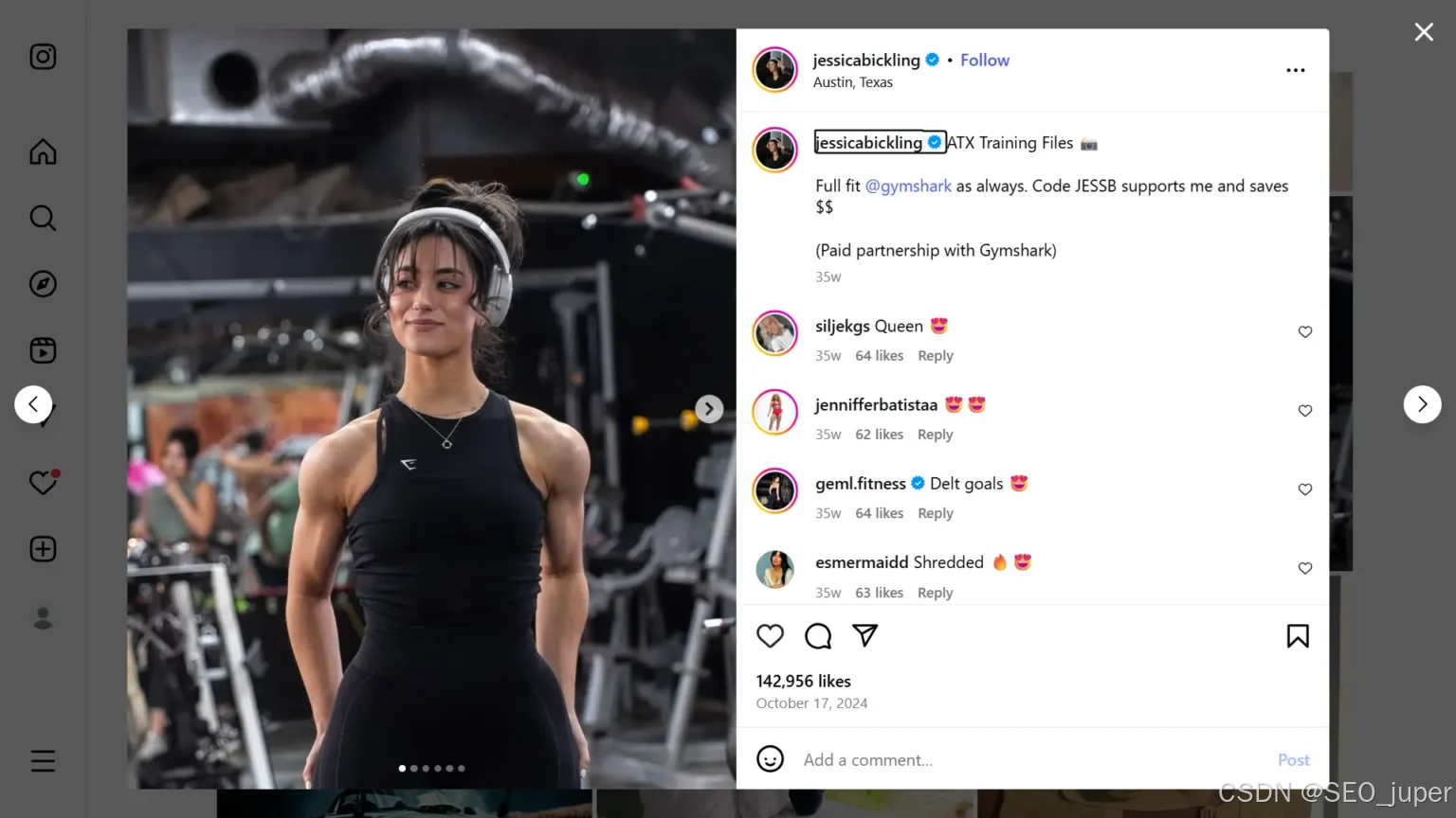 赞助内容无处不在,尤其在社交媒体上。下图这篇Instagram帖子明确标注为"与Gymshark的付费合作"。该内容之所以显得真实可信,是因为它来自受信任的网红账号而非品牌广告号。