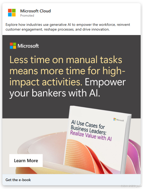 这不仅适用于B2C领域。如下所示的领英广告中,微软针对银行业专业人士推出了电子书下载优惠活动。