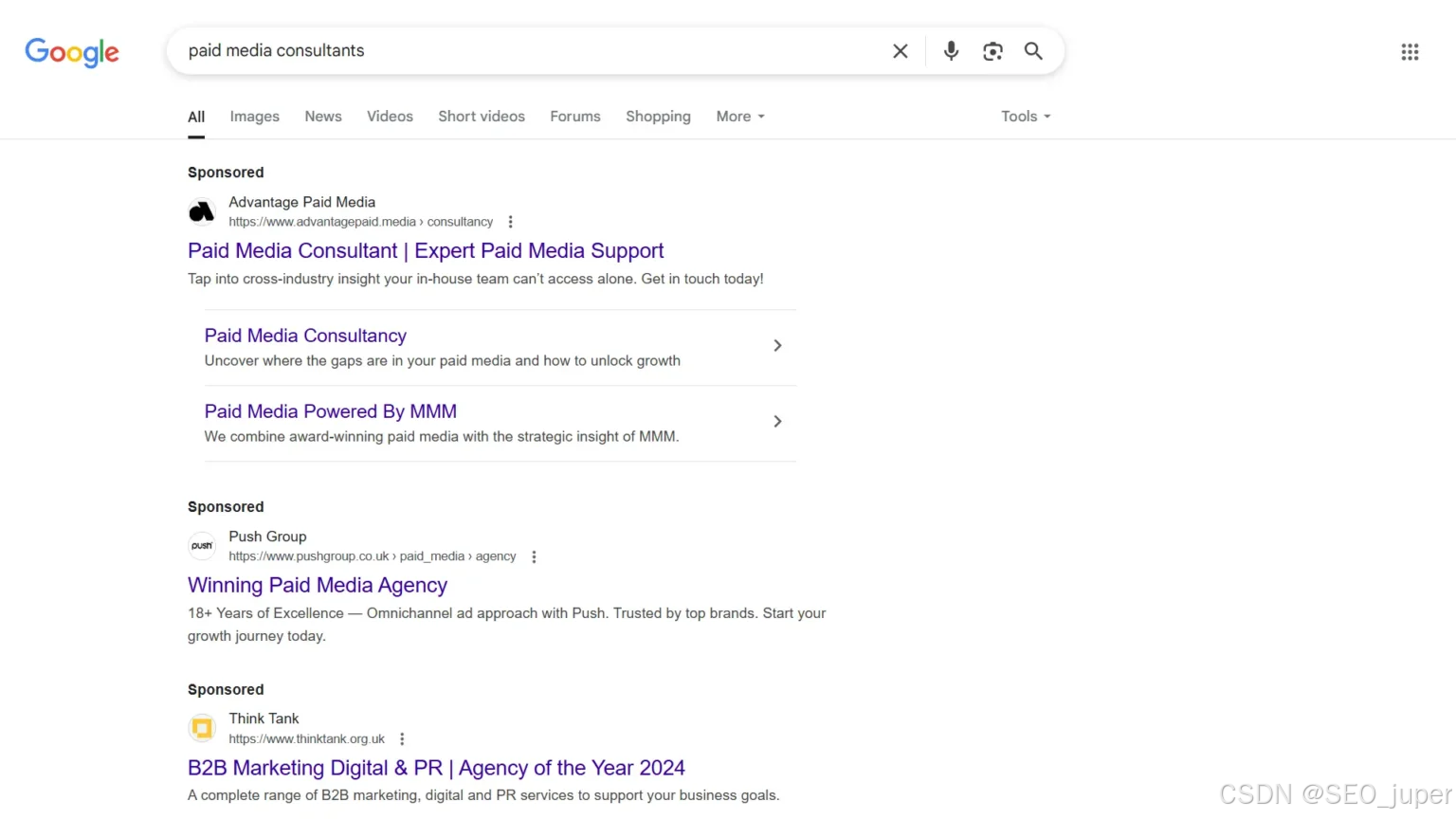 以下是关键词"付费媒体顾问"的搜索引擎广告示例。请注意"赞助商链接"标签,该标识帮助用户区分付费广告与自然搜索结果。
