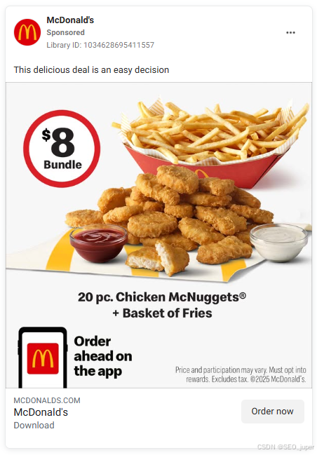 以下是Facebook付费媒体广告的示例。这条由麦当劳投放的赞助内容出现在相关顾客的动态消息中,吸引他们尝试售价8美元的麦乐鸡套餐。这类广告既能自然融入信息流,又能清晰传达行动号召。