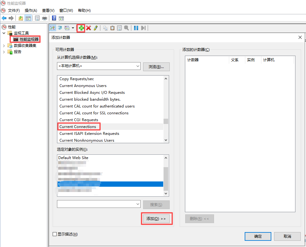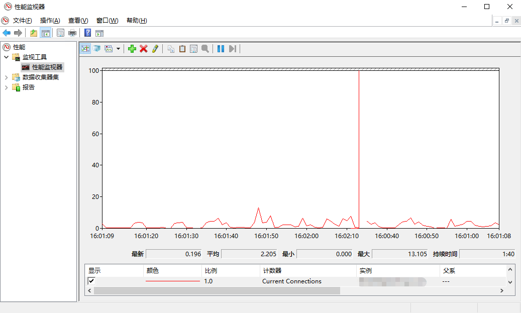 一、首先打开搜索框或者运行框,输入perfmon.msc 二、打开监视工具-->性能监视器,WebService=>Current Connections, 选择想观察的网站 三、如下,已经可以看到当前网站的连接数了