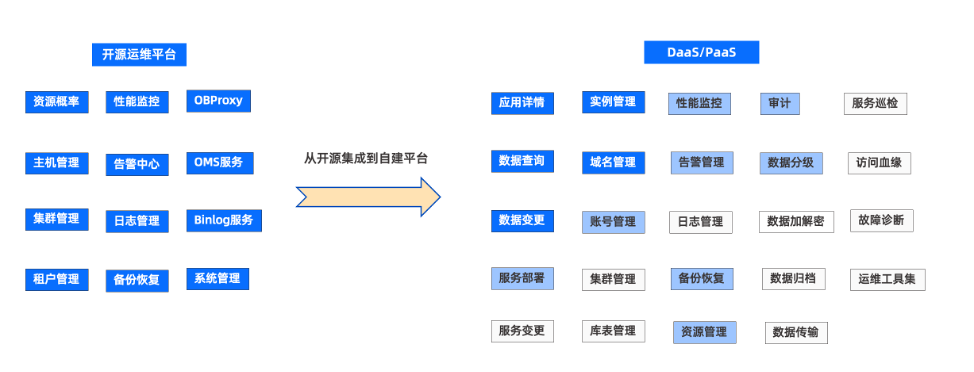 如图3所示,蓝色背景白色字体对应的功能是已经建设完成的功能;蓝色背景黑色字体是正在建设的功能;白色背景对应的功能为后续规划。通过平台整合,最终形成统一的内部自建运营平台,实现对开源平台的全面替代。