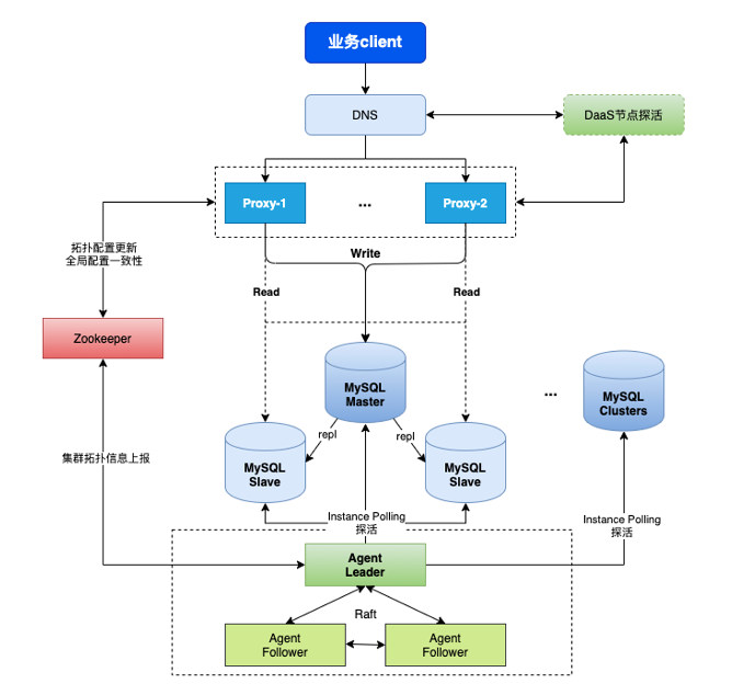 在过去十多年,vivo一直使用MySQL作为底层数据库。如图1所示,vivo的 MySQL 集群使用双层异步复制架构:上层通过自研代理服务 Proxy 实现加解密、审计、连接池等能力,并通过运维平台对 Proxy 进行完全自动的运维管理,实现了探活、自动切换、自动部署等能力;最下层的 Agent 用于故障切换,通过 Raft 实现了多节点高可用部署;中间的Zookeeper 用于同步 MySQL元数据信息,保证 MySQL 集群间的数据一致性。
