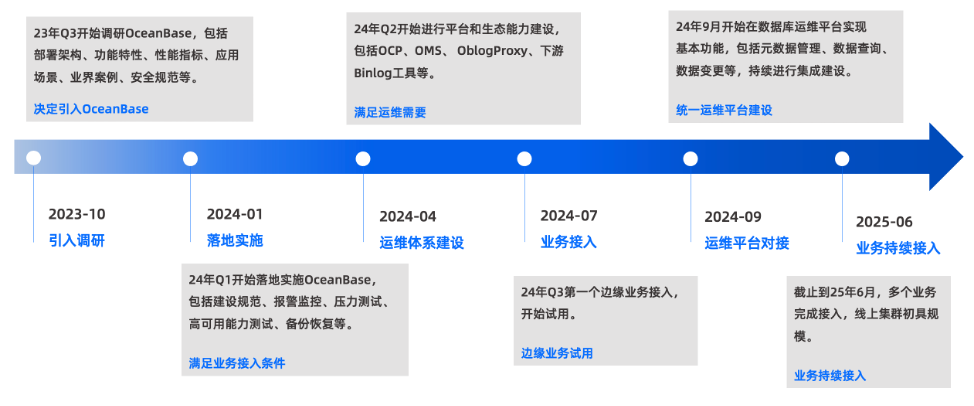 具体而言,自 2023 年第四季度起,存储运维团队开始启动系统化调研,对部署架构、功能特性、性能指标、应用场景、成功案例、安全规范等方面进行调研评估。调研完成后,经部门级评审,正式决定引入 OceanBase 进行平台建设(见图2)。