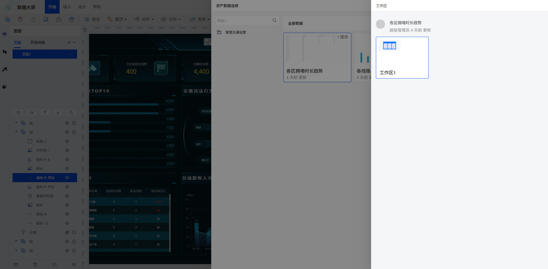 完成后回到大屏,选中指标卡绑定同比、环比数据,各区域拥堵时长趋势即可清晰呈现。