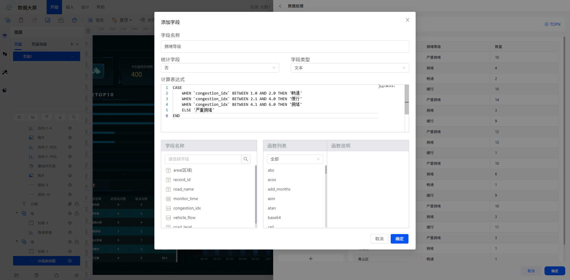 选择主干道拥堵原始数据,利用平台数据字典将区域编码翻译为区域名称,通过“编辑字段” 功能用计算表达式定义拥堵等级。