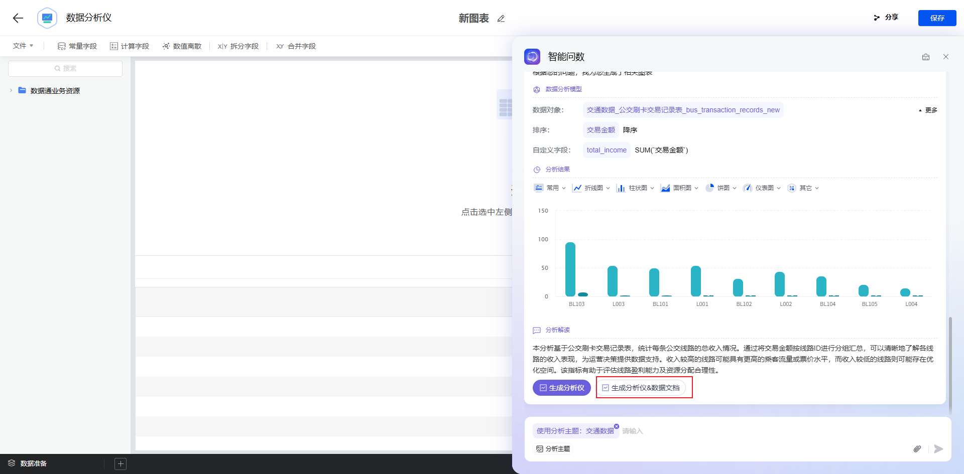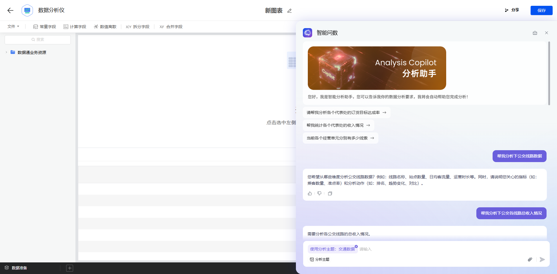 分析“各线路总收入”,只需在智能问数助手中输入需求,助手会主动追问补充条件