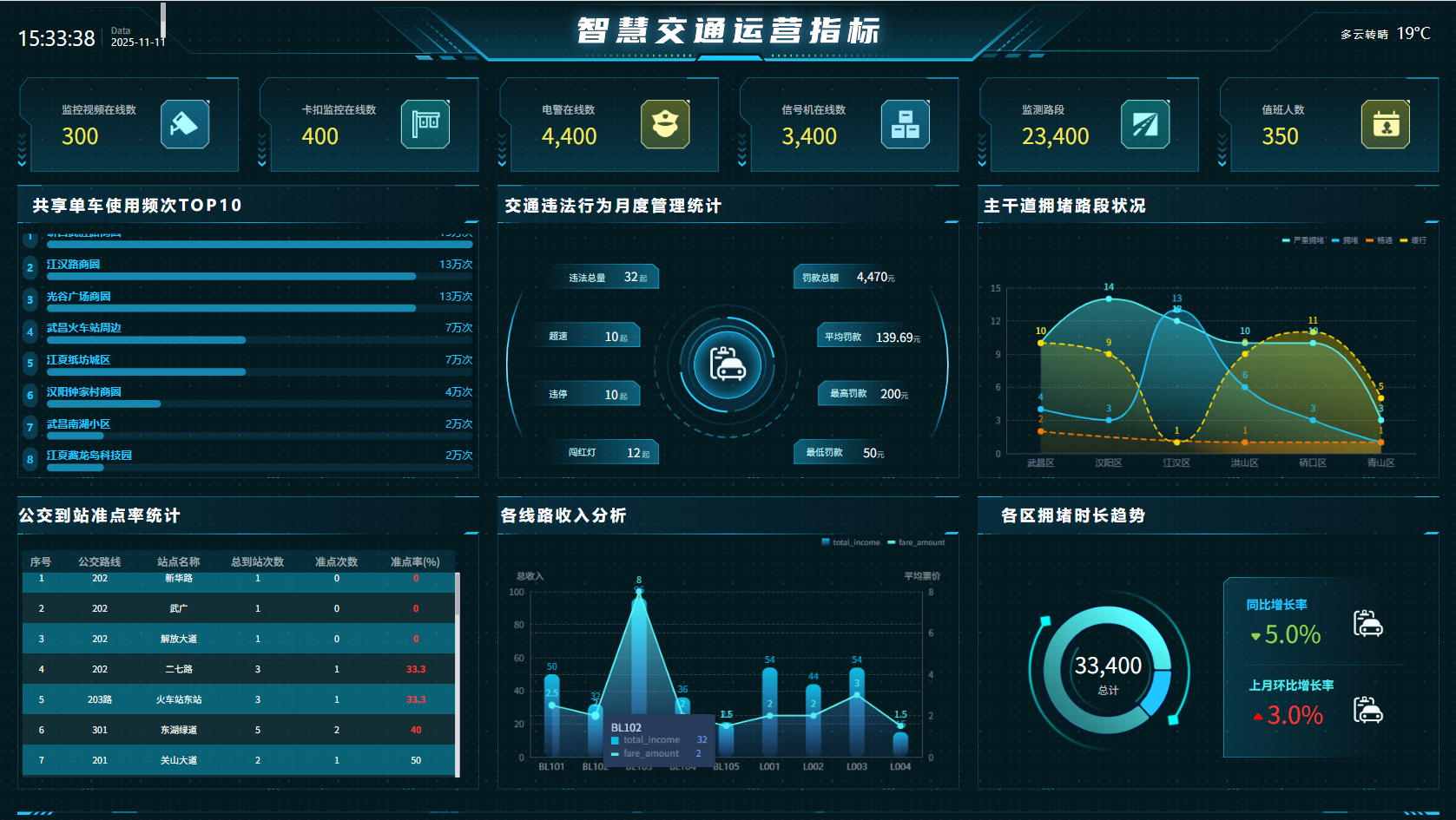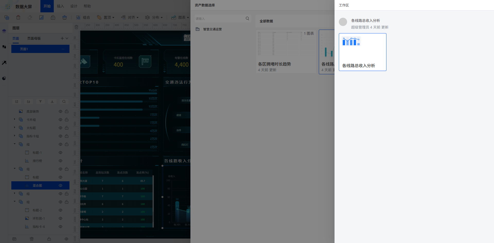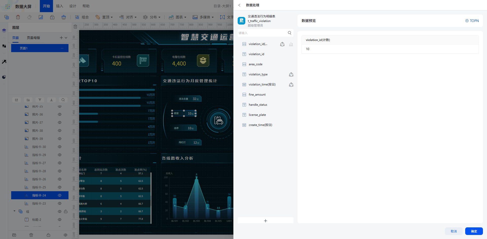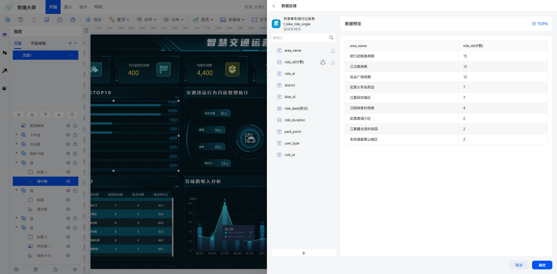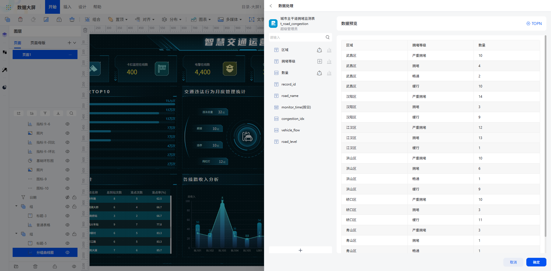 所有图表数据绑定完成后,一键预览即可查看大屏全局效果,各板块核心指标与区域数据精准呈现,满足交通运营的实时监控与决策需求。