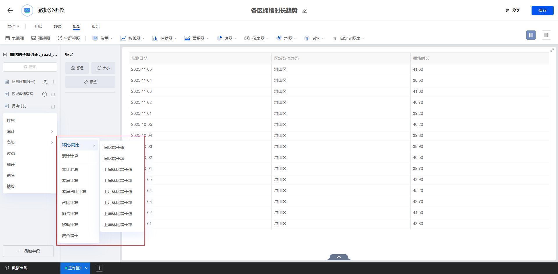 创建工作区,以“监测日期” ,“区域”为维度,调用平台预置算法计算同比、环比增长率。