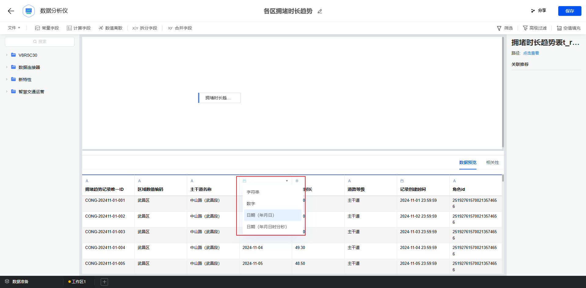 处理“拥堵时长趋势” 数据时,先选择原始数据并将 “监测日期” 转换为标准日期类型。